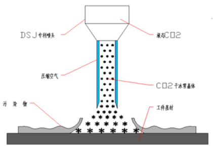 1um雪花晶體+壓縮空氣噴射到工件表面污染物脫離表面被壓縮空氣吹出表面